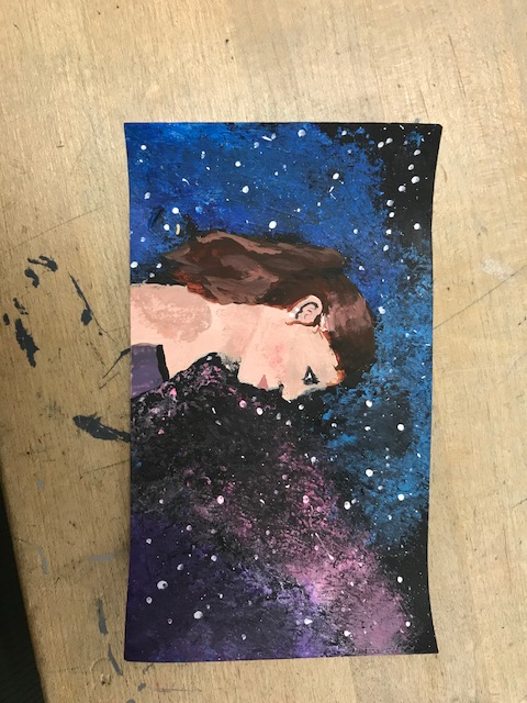 My final for my art class was a self portrait. I decided to do mine on a postcard size piece of paper and used acrylic paints as my medium. The subject in the painting is a side profile of myself, while the background is a simple galaxy including hues of blue, purple and pink, with stars speckled throughout. The title of this piece is “Infinite Thoughts.” I named it this because at times, I feel like my mind is always racing and goes on forever, just like the universe. A unique technique that I used was putting a bit of paint on the end of a crumpled paper towel, and stamping it onto the background to give a good galaxy effect. I also used a flat brush and flicked it while it had white paint on the end to create small stars spattered throughout the background. My inspiration for this artwork was my brother. He is a photographer and I love the pictures of the sky and stars he has done. They are some of my favorites. I also feel that I can relate to his artwork. I tried to express a sense of curiousity in my artwork, and hopefully I achieved that. My goals as an artist is to just create more. I really enjoyed this class and getting to be creative everyday, and I need to push myself to do it more often. I also want to do more of what I wanted when creating, and I feel like I did. I don’t prefer to do still lifes and really realistic things, nothing personal I just don’t enjoy them. And with this assignment I was able to add my own ‘flair’ to my piece. While creating this piece, I learned that I am really judgemental of myself. Especially my abilities. I don’t exactly like how it turned out, and wish that I was better, but that takes time, and I need to accept that.